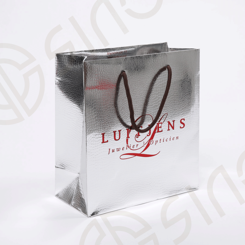 Sharing a similar construction as Euro tote bags, custom printed silver foil paper gift bags offers the retail industry an luxury and time efficient way to package presents for their customers. Gift paper bags feature folded edges and a gusset bottom to be able to hold and carry products without needing a heavyweight paper material or lamination. The nylon handles make transporting products convenient for customers while still offering them a gift-like experience through the bag.
